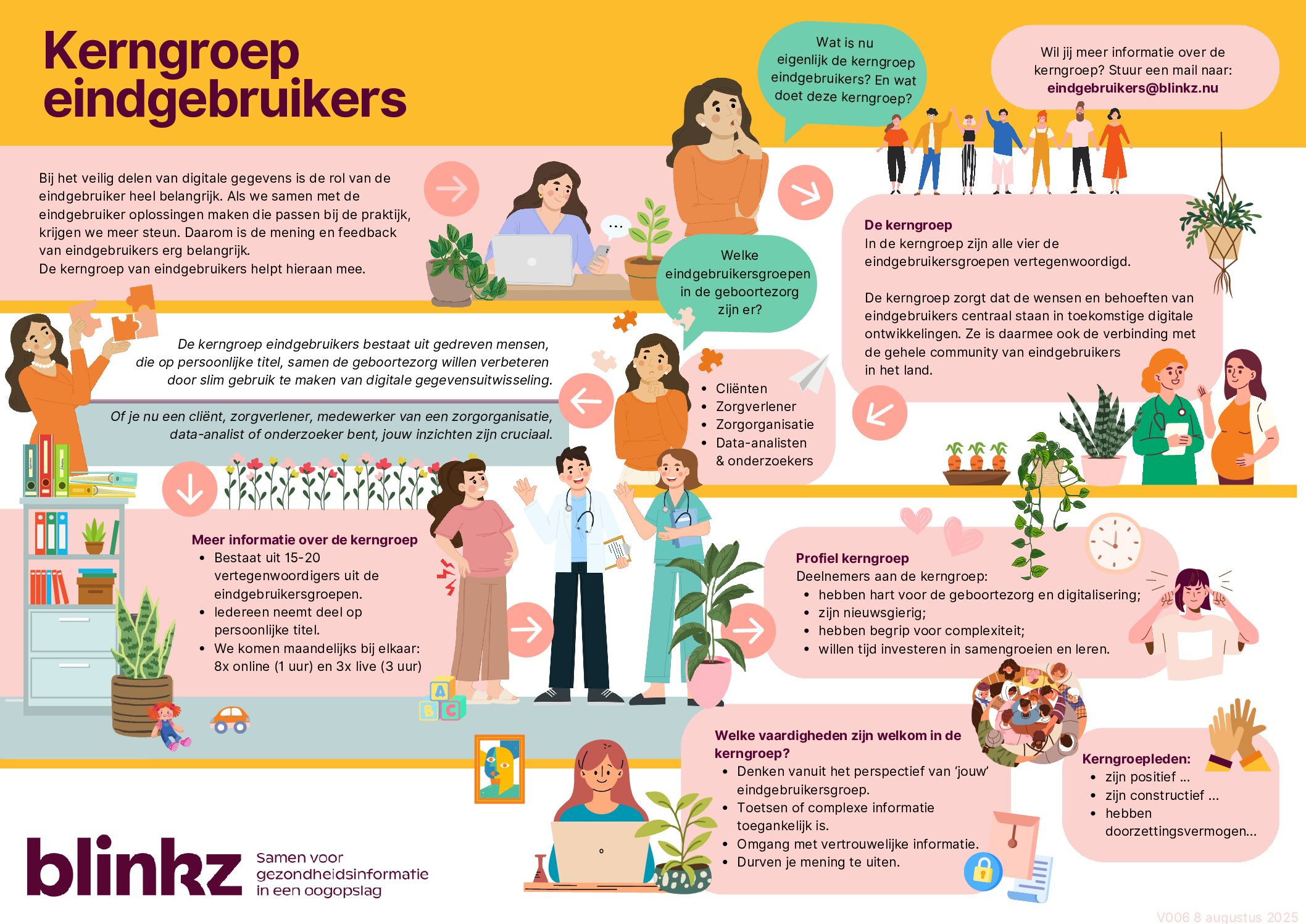 De kerngroep eindgebruikers bepaalt de ontwikkelagenda: welke onderwerpen krijgen voorrang en worden als eerste opgepakt? Daarbij volgen we steeds de wensen en behoeften van de praktijk. De input komt uit verschillende hoeken: regionale eindgebruikers, de landelijke community en via het Blinkz informatiepunt. Zo wordt de agenda gevoed door wat er écht leeft in de geboortezorg.